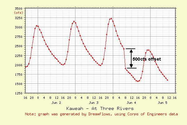 to about 1500 cfs at Three Rivers on the COE gauge. That also says Hospital Rock and the East Fork will still be cranking over the July 4th holiday.