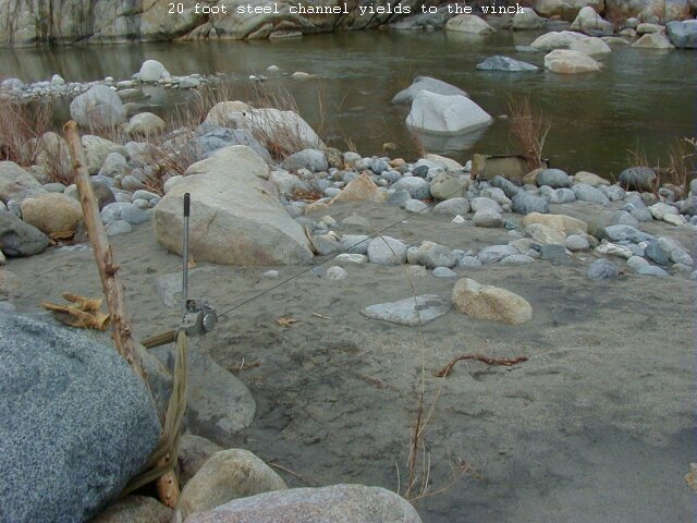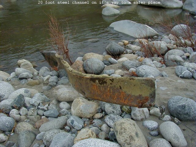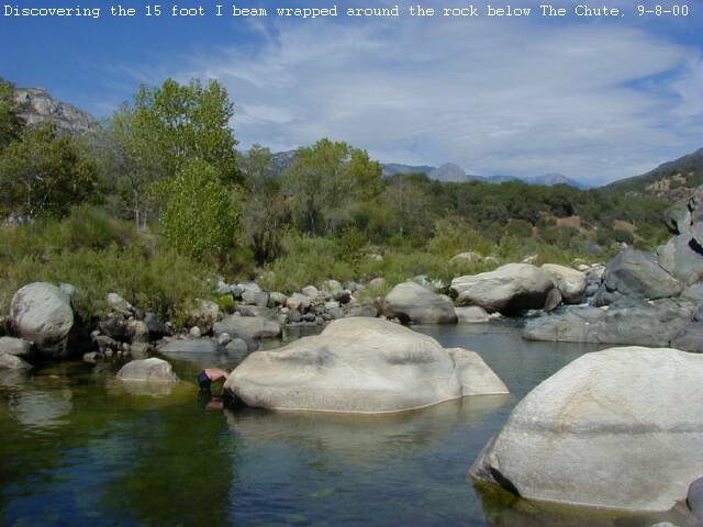09-11-00 A 15 foot I-beam is wrapped around a large boulder just below the Chute. Prior to the flood of Jan. 1997